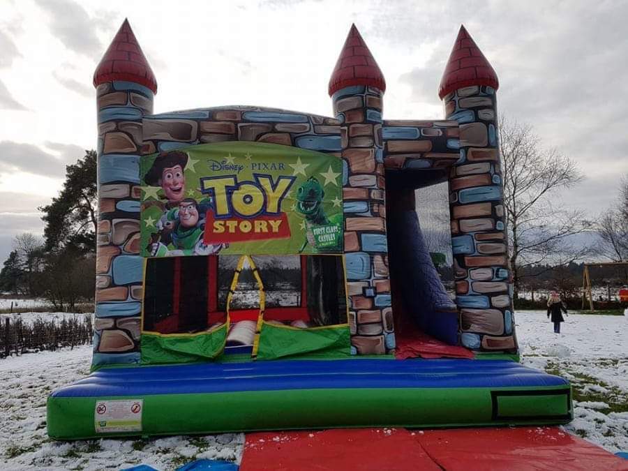 This particular castle is probably my most popular bouncy castle. It suits all ages & is covered in so you are protected from the weather. It's one of our castles that does look like a castle. This castle has a large bouncy area, with a climbing stairs that leads up to the top of an 8.5ft high internal slide.The castle is enclosed by netting and it also has an exterior basket ball hoop on the outside. You can bounce, slide and shoot with this castle.