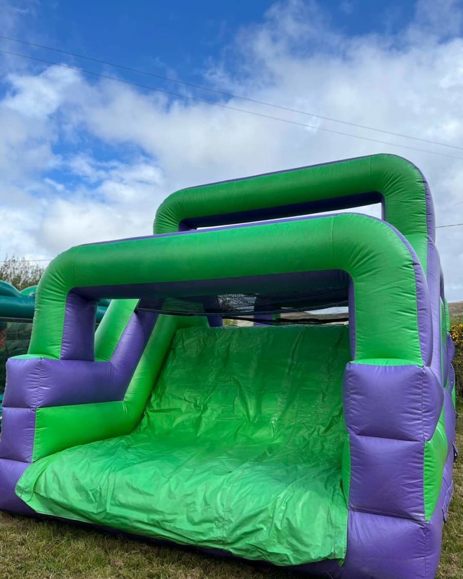 This inflatable is a two part unit that consists of a series of obstacles that can be climbed over & under. It also includes a climbing wall & a slide at the end of the obstacle course. This castle is ideal for all ages.